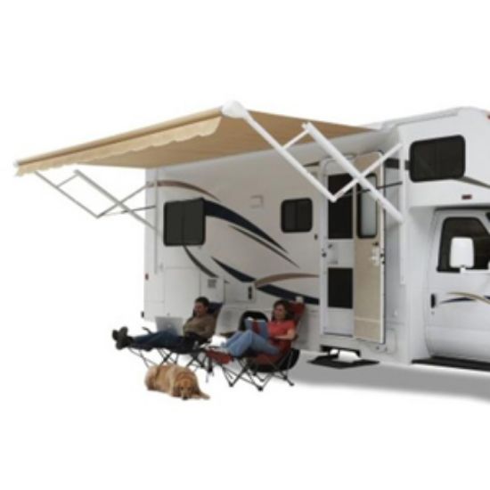This camel shale faded awning has adjustable (Adj) pitch, white weather cover and the required arms are sold separately.