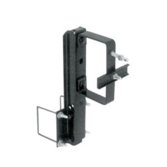 It fits a rear 4 to 4-1/2 inch square bumper mount. It has tire padlocking. It is powdered coated black.