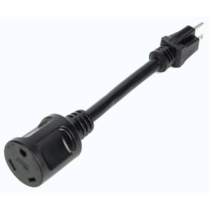 It adapts all brands of RV plugs. Triangular plug adapter connects 15 amp female to 30 amp male. Includes an easy grip handle. Sold in carded package.