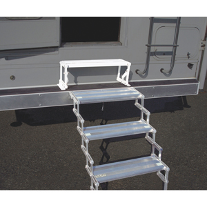 The Basement Camper Step ensures safety when entering and exiting basement model truck campers. It reduces the 14" gap commonly found between the bumper and entry door. This 8-inch tall step folds up and down, glows in the dark and is high impact powder-coated white.